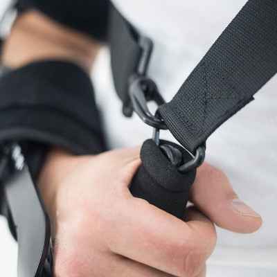 - Φέρει μαλακά μαξιλαράκια προστασίας του αγκώνος και ρυθμιζόμενη τιράντα ανάρτησης άκρας χειρός.